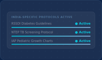 Evidence-based treatment protocols adapted to Indian drug formularies, patient demographics, and regional disease prevalence — not just Western guidelines.