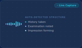 Records clinical context directly from doctor-patient interactions during the visit itself — not from retrospective dictation. The AI understands the structure of a consultation: history, examination, impression, and plan.