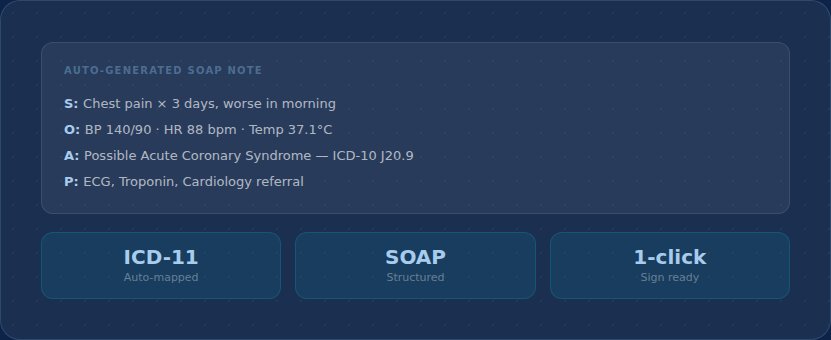 Organises consultation signals using deterministic clinical frameworks — SOAP structure, ICD-11 mapping, and specialty-specific templates — so every output is physician-reviewable, auditable, and ready to sign. No black-box outputs doctors can't trust.