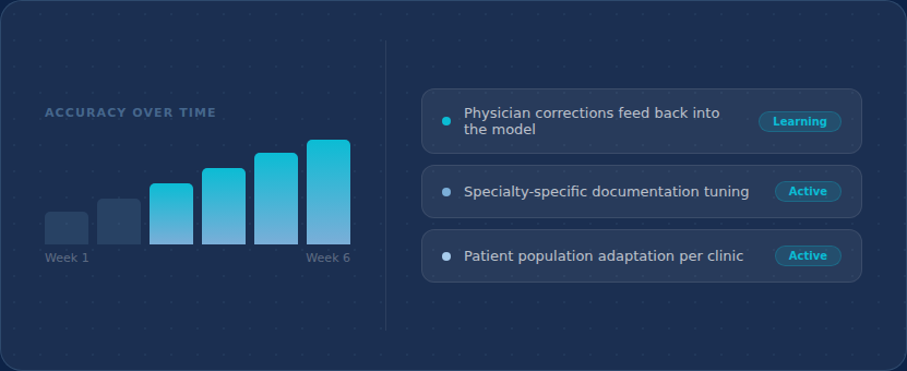 Continuously improves from physician-approved documentation and real workflows. Every correction a doctor makes feeds back into the model — so Qortexa gets more accurate with your specialty, your patient population, and your documentation style over time.
